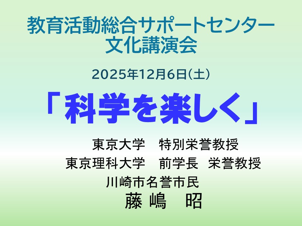 今回の講師は化学者の藤嶋昭氏。藤嶋氏は2017年に文化勲章を受賞し、2018年に川崎市名誉市民になられています。東京大学大学院在学中に水を水素と酸素に分解する光触媒の反応を発見。光触媒は環境の浄化など様々な分野で活用されており、 その研究成果によりノーベル賞候補として名前があがる川崎在住の日本が誇る研究の第一人者です。