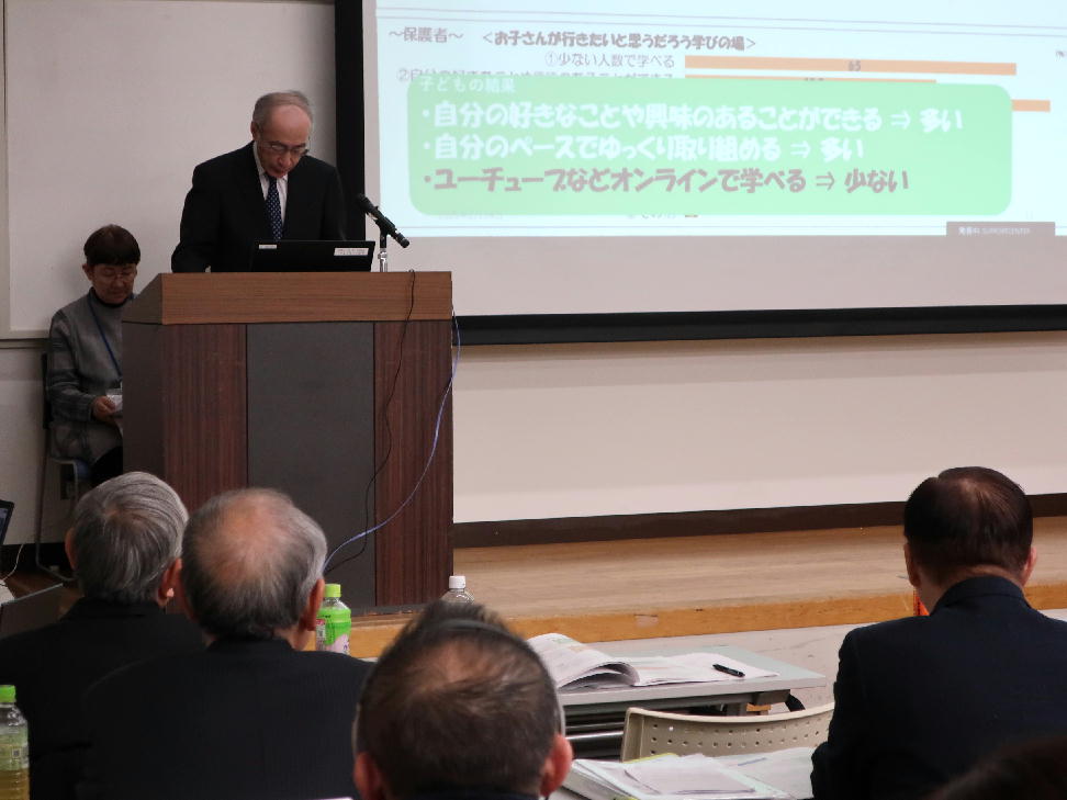 当日は、川崎市総合教育センター所長 大野恵美様 から新学習指導要領の動向を含めてご挨拶をいただきました。続けて、当サポートセンター理事長 田中真喜男から研究の経過を含めて挨拶をいたしました。